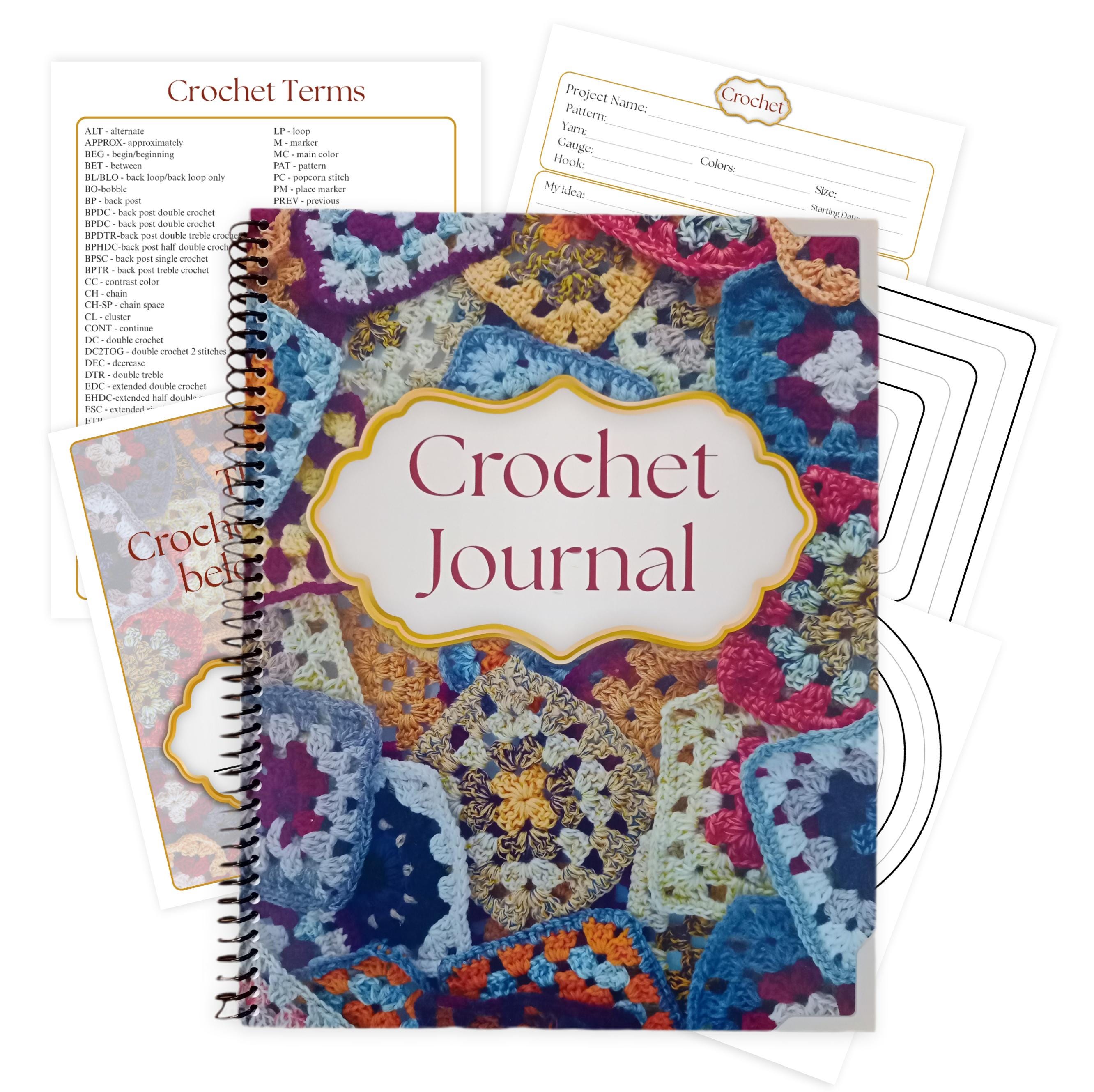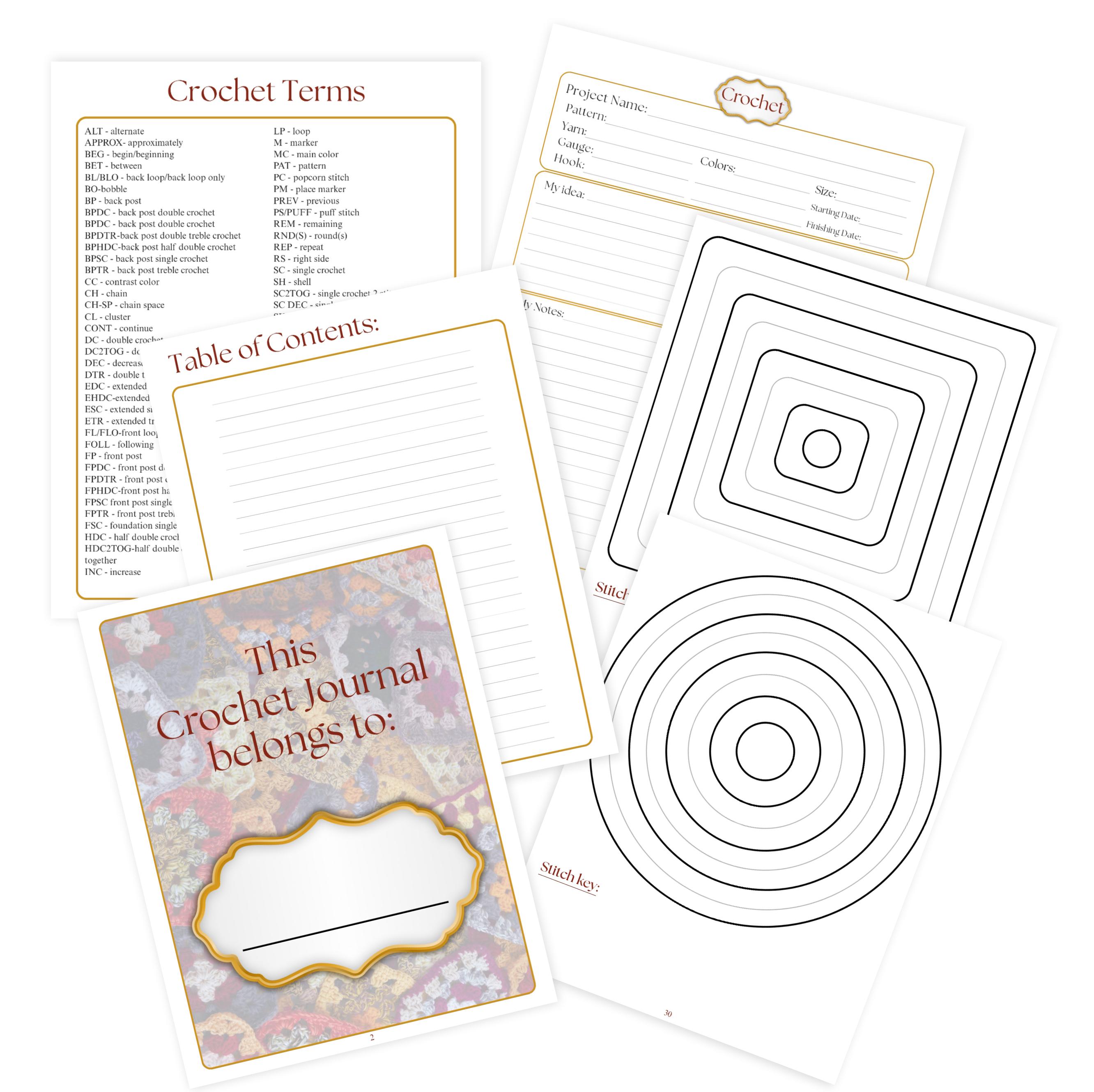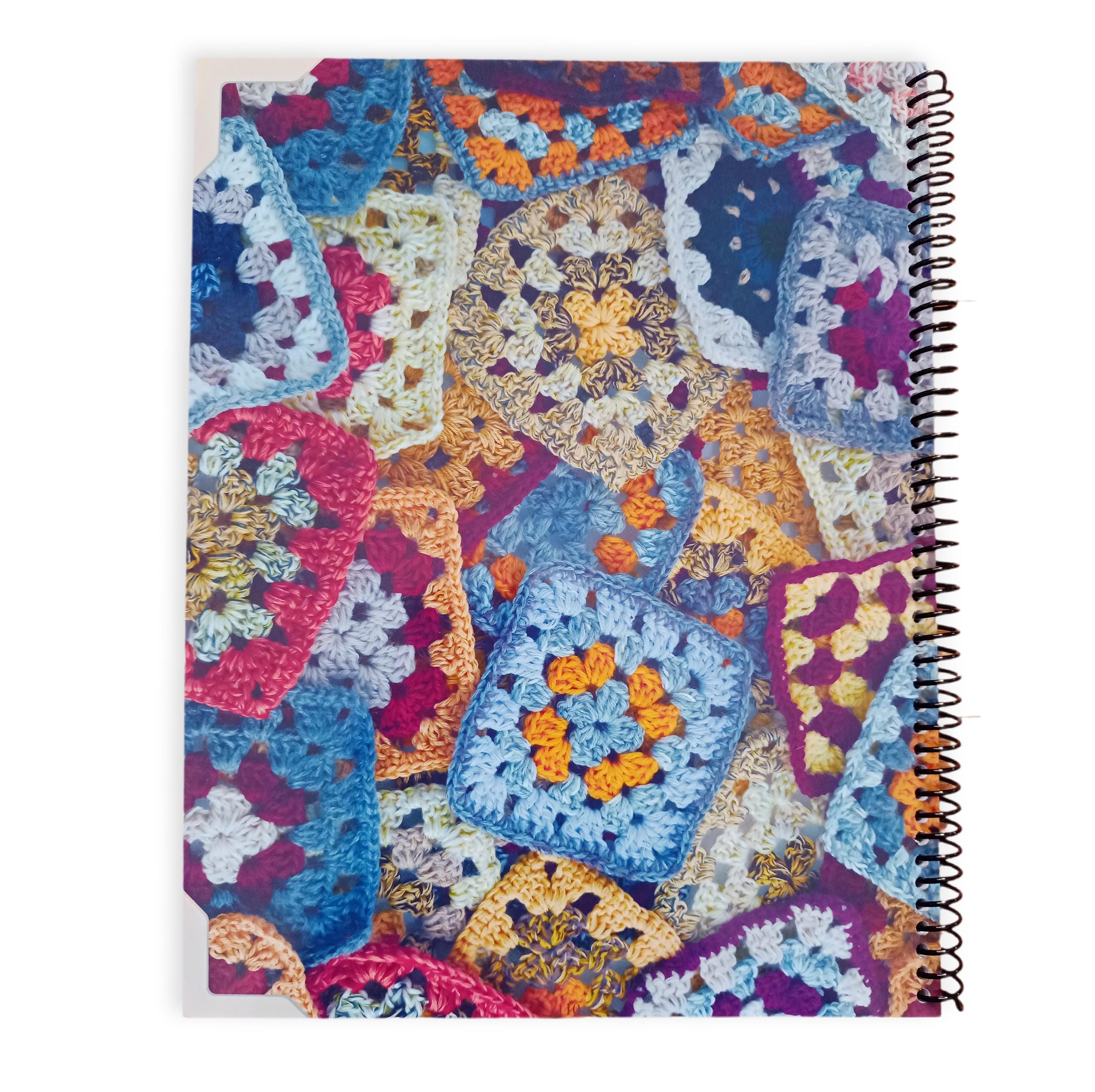 This Crochet planner features a clean, user-friendly layout with a 100-line fill-in Table of Contents, glossary of crochet terms, square and circle granny square design pages for up to 8 rows and 100 project planner pages.